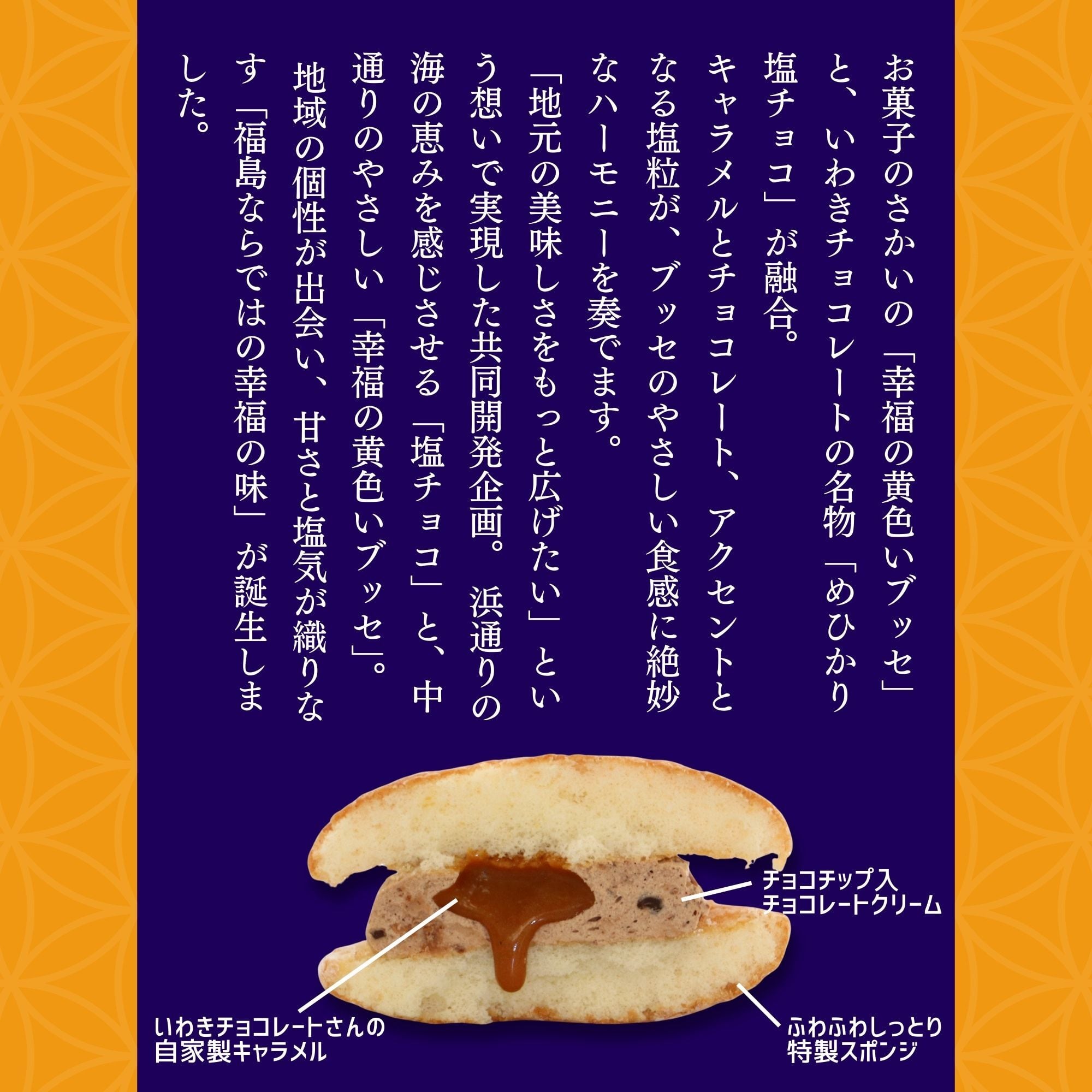 浜通りの海の恵みを感じさせる「塩チョコ」と、中通りのやさしい「幸福の黄色いブッセ」。