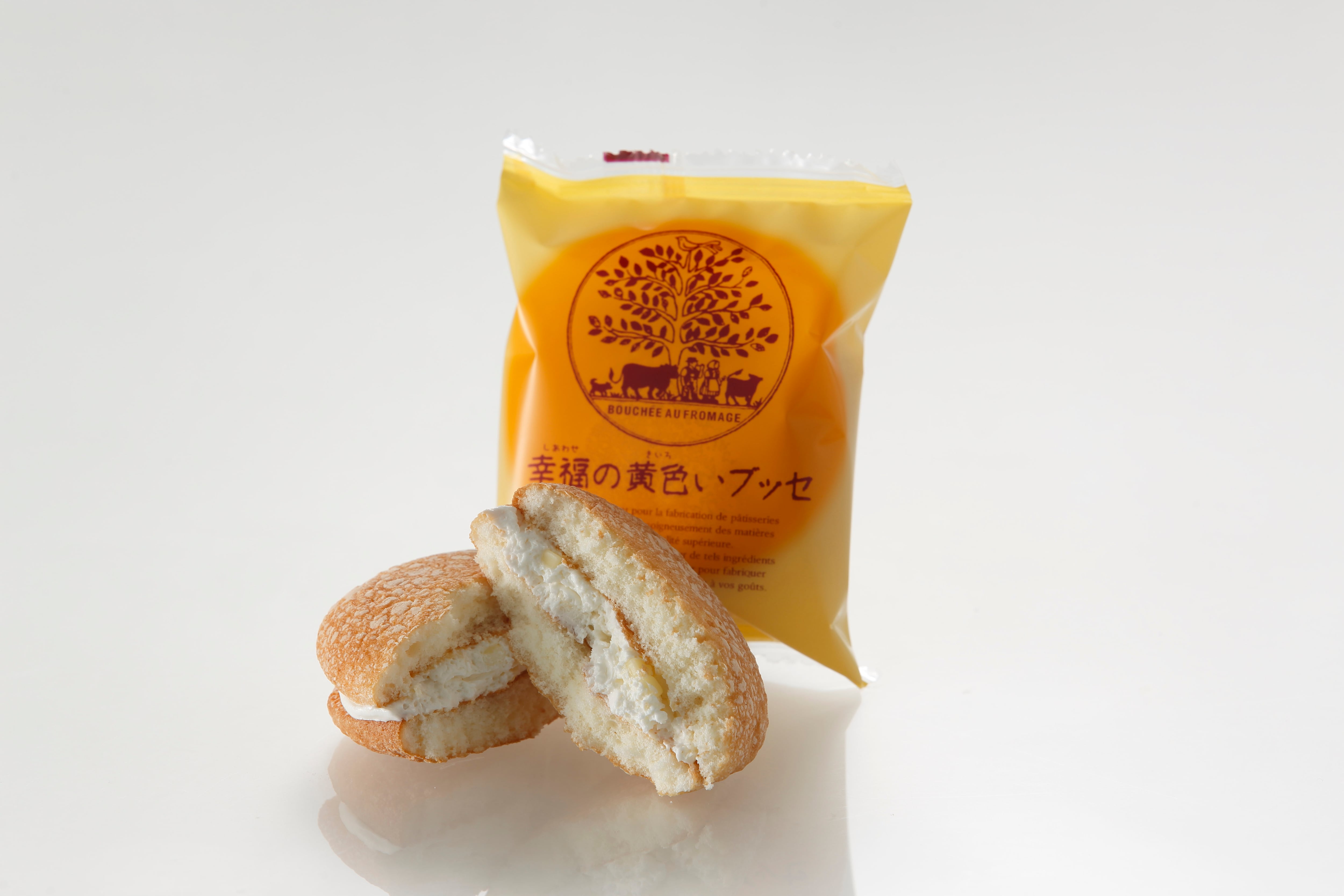 原材料名:(幸福の黄色いブッセ:チーズブッセ)バター、卵、小麦粉、砂糖、ナチュラルチーズ、植物性油脂、小麦澱粉、ブドウ糖、食塩、異性化液糖、コーンスターチ / ソルビトール、乳化剤、膨張剤、セルロース、香料、カロテン色素(一部に卵・小麦・乳成分・大豆を含む)