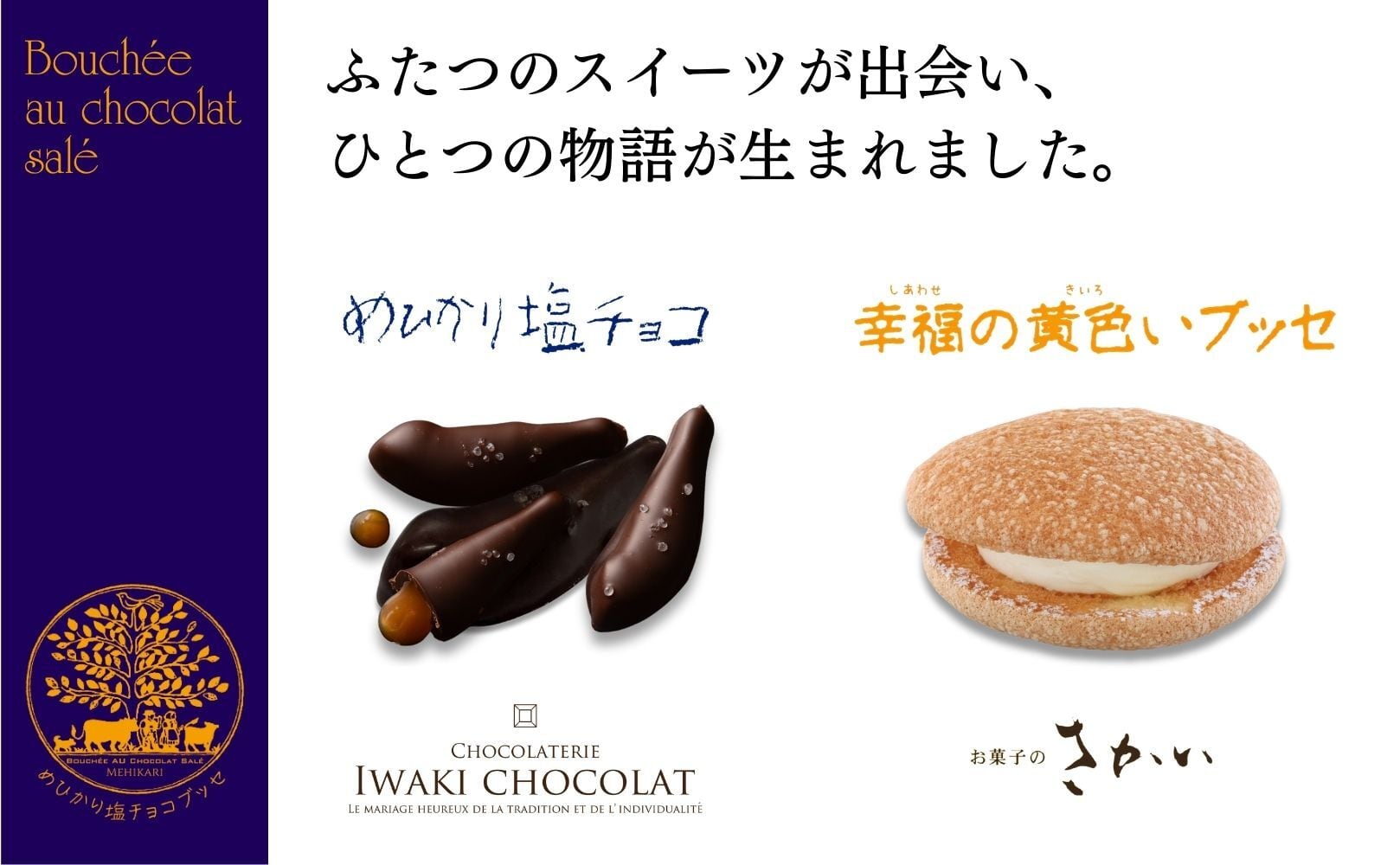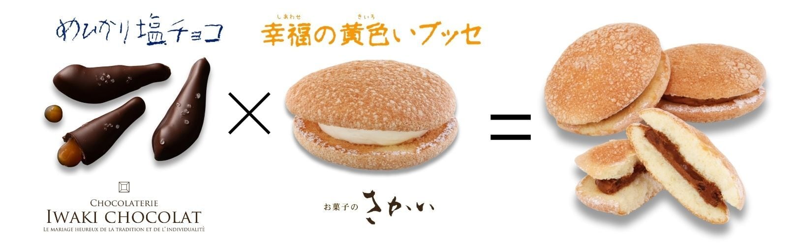 お菓子のさかいの「幸福の黄色いブッセ」と、いわきチョコレートの名物「めひかり塩チョコ」が融合。
